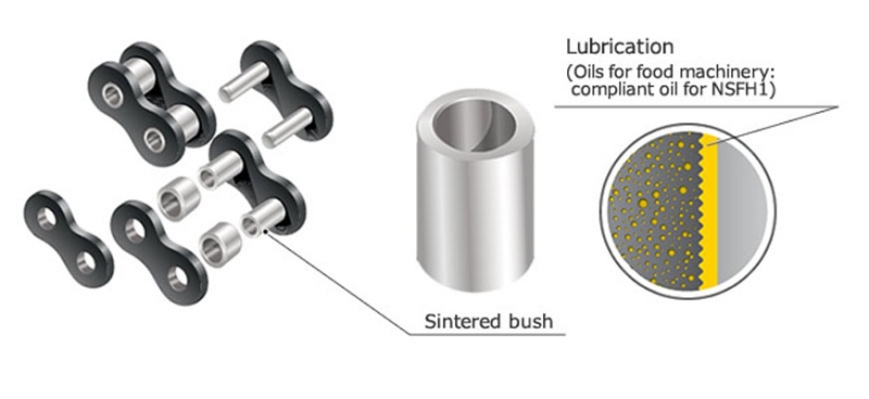 Loại xích này (được bôi trơn sẵn bằng dầu mỡ đặc biệt nằm trong ống lót/bụi cây thiêu kết), là giải pháp tuyệt vời để loại bỏ vấn đề đông đặc chất bôi trơn.