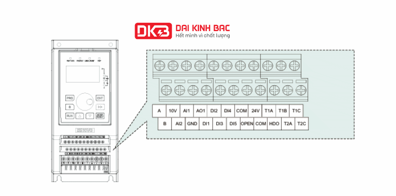 - Chân điều khiển gồm COM, DI, AI, AO dùng cho nút nhấn, biến trở hoặc PLC