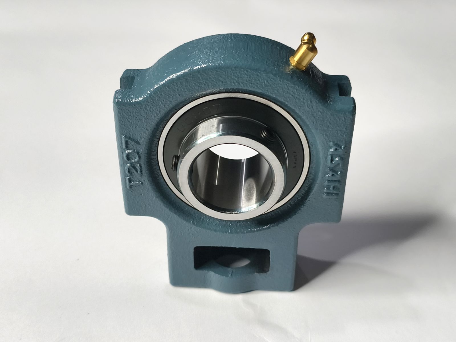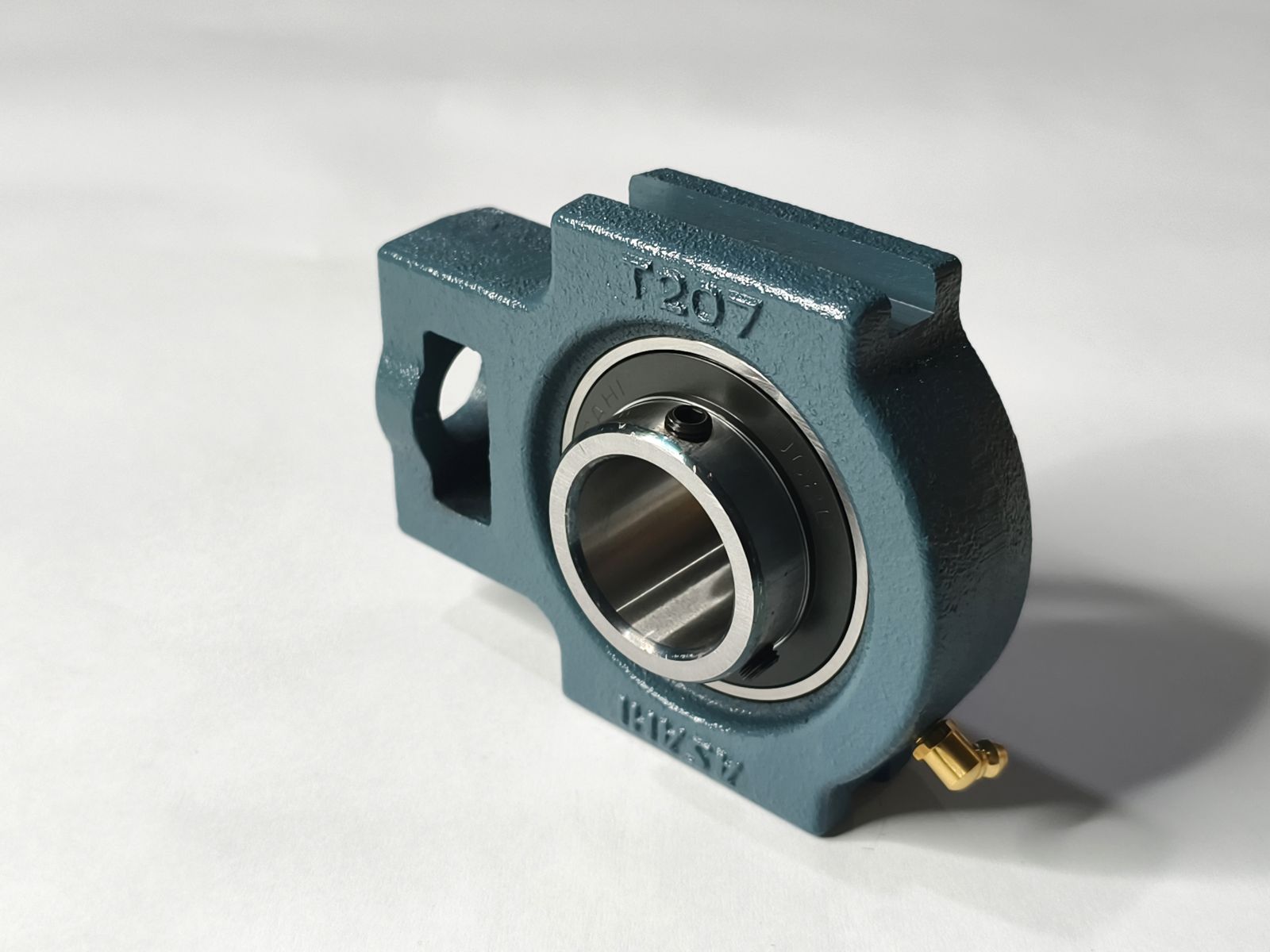 Vỏ gối T207: Được đúc từ gang chịu lực cao, thiết kế dạng trượt cho phép dịch chuyển vị trí trục theo phương ngang. Nhờ đó, người dùng có thể dễ dàng tăng chỉnh độ căng của dây đai, xích tải hoặc băng tải.