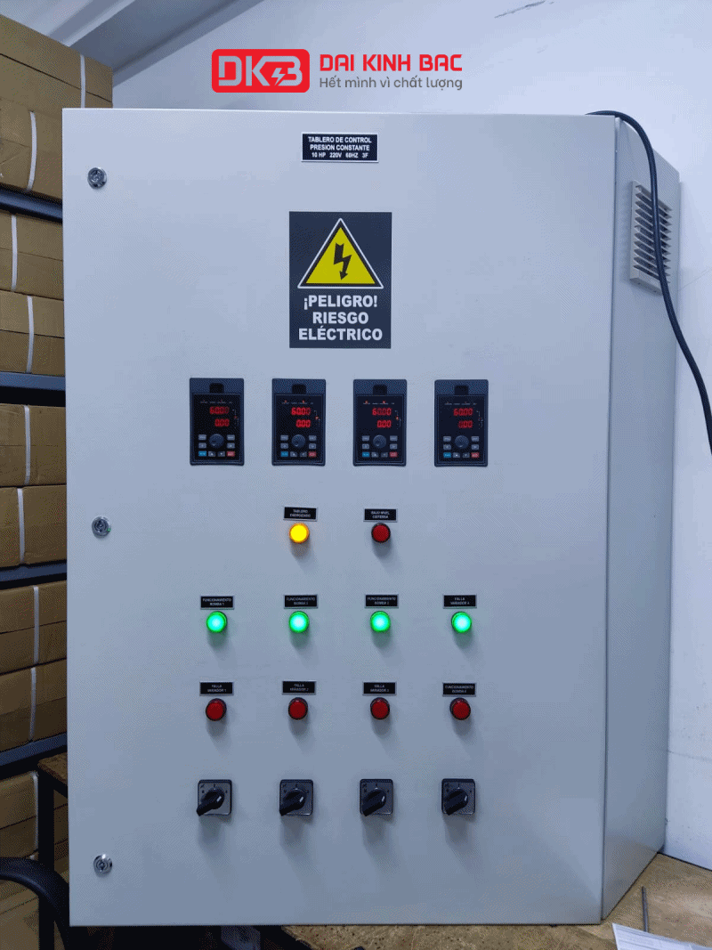 b. Có tủ điện gồm thiết bị: át tô mát, đồng hồ vôn, đồng hồ ampe, khởi động từ, rơ le nhiệt, rơ le bảo vệ mất pha, dây tiếp đất.